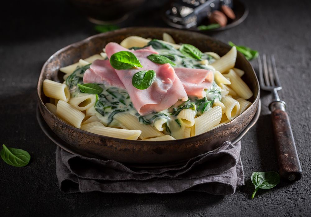 - Энергично перемешайте и приступайте к сервировке: выложите макаронные изделия на тарелку, сверху – соус из шпината и рикотты, украсьте ломтиками ветчины.