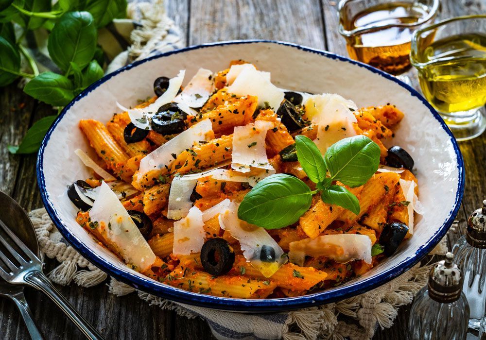 - Тем временем отварить пенне аль денте и выложить в соус. Добавить маслины, перемешать и прогреть в течение минуты.